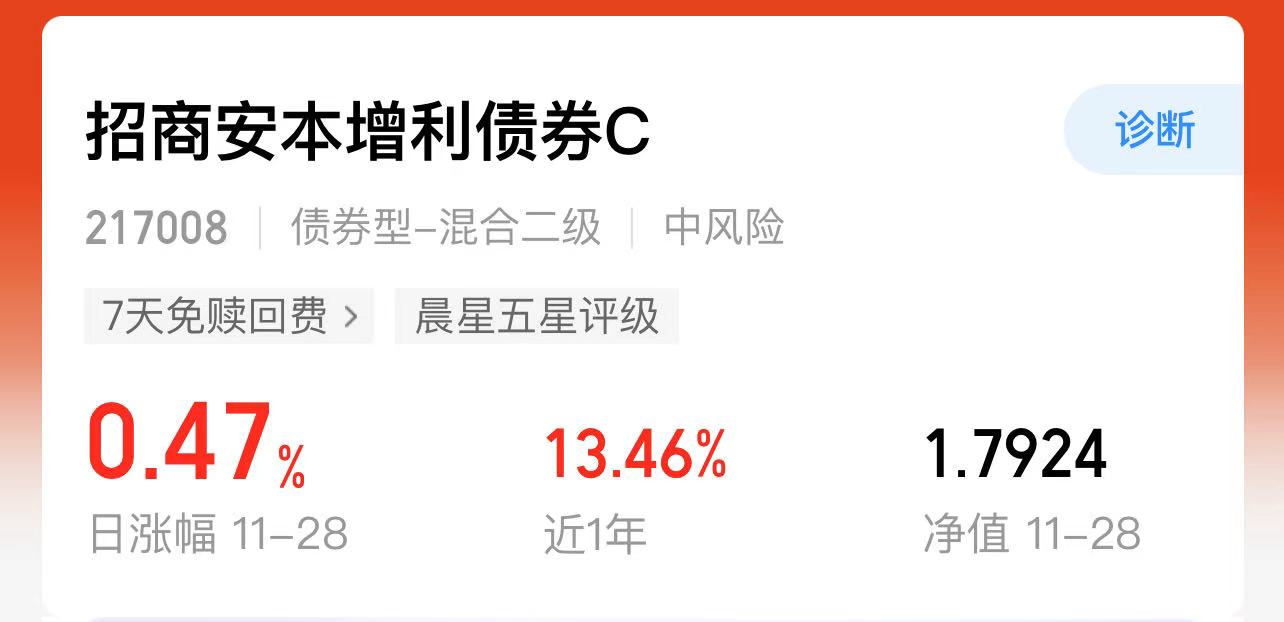 招商安本增利债券 C 上周五净值上涨 0.47%。近期债市情绪逐步修复,长端利率小幅回落,叠加信用利差保持稳定,组合表现稳健向上。作为一只偏稳健收益的债基,它在波动环境下继续展示了良好的抗震特性,适合作为组合里的稳定器,平滑整体回撤。