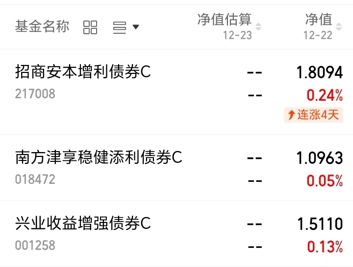 昨日债券市场整体偏弱,利率债和信用债表现都一般般。权益市场主要指数逐级走高,热门板块领涨,市场回暖明显之下,固收+的表现不错。我拿着的$招商安本增利债券C(OTCFUND|217008)$昨天收了24个蛋,收获不少呢,看看其他基昨日抱蛋情况: