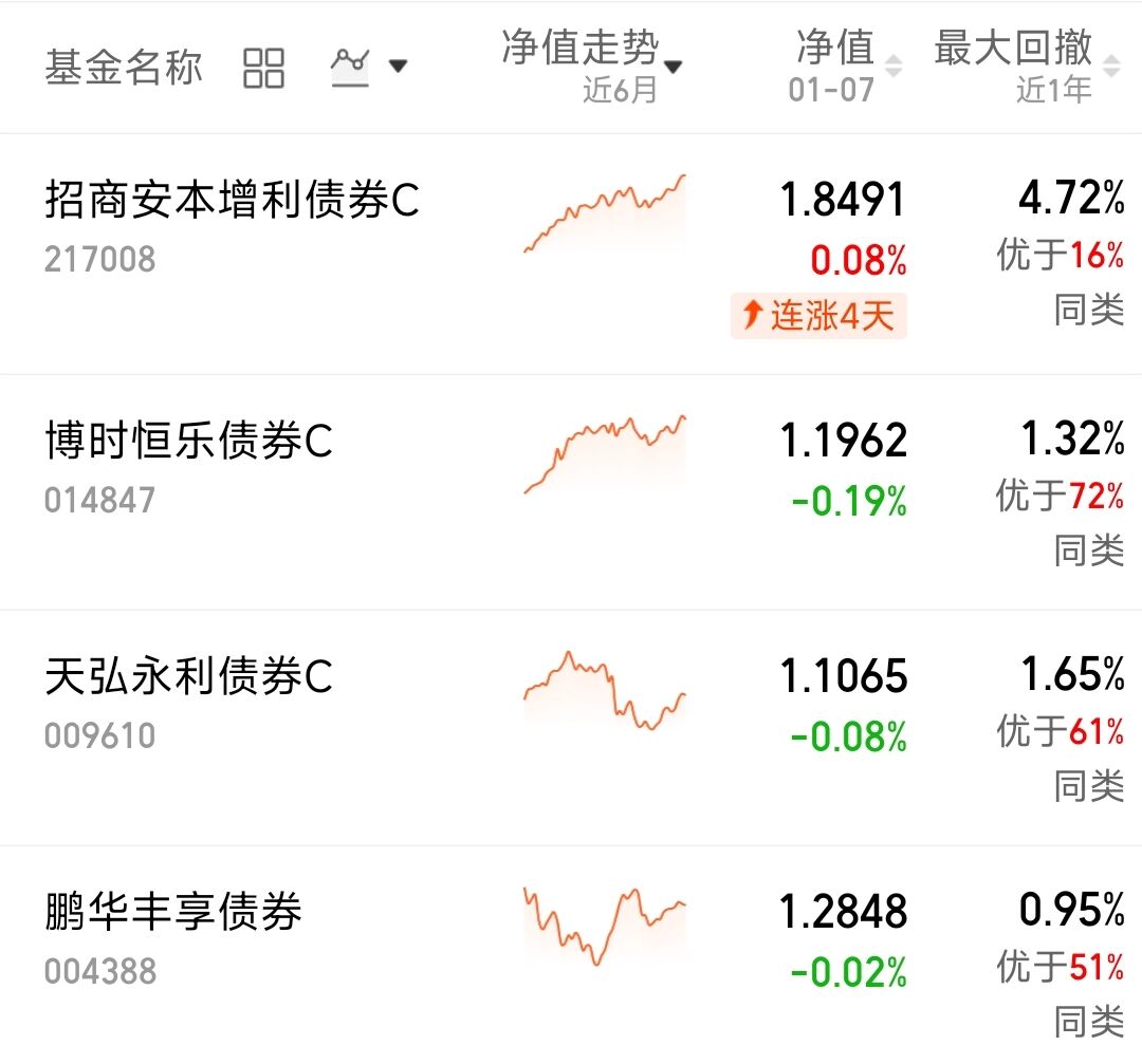 偏债基金性价比超高!风险远低于股票基金,收益却比纯债基金更有优势,新手也能闭眼入。遇到震荡市行情反复的时候,偏债基金更是稳如泰山。它的净值波动小,不管市场涨跌都不用慌,$招商安本增利债券C(OTCFUND|217008)$昨日收了8个蛋,$天弘永利债券C(OTCFUND|009610)$碎了8个蛋,$博时恒乐债券C(OTCFUND|014847)$碎了19个蛋。