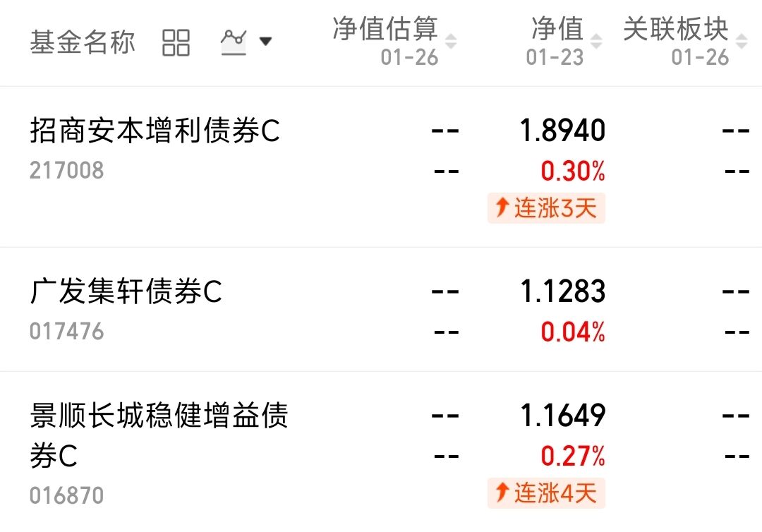偏债基金就是 “懒人福音”,买入不用频繁操作,波动小不揪心,长期持有收益可观。快过年了,止盈资金放货币基金怕踏空,留股市又怕亏收益,固收 + 刚好是好选择。$招商安本增利债券C(OTCFUND|217008)$上周五收了30个蛋,$广发集轩债券C(OTCFUND|017476)$收了4个蛋,$景顺长城稳健增益债券C(OTCFUND|016870)$收了27个蛋。