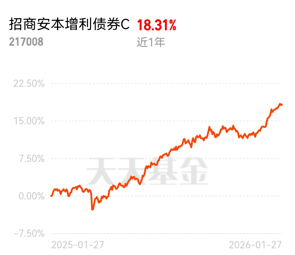 闭眼入的稳健债基来了,招商安本增利债券 C 近 1 年收益 18.31%,基金经理有色化工出身,适配今年的市场节奏,机构认可度超高,闲钱打理的绝佳选择。$招商安本增利债券C$