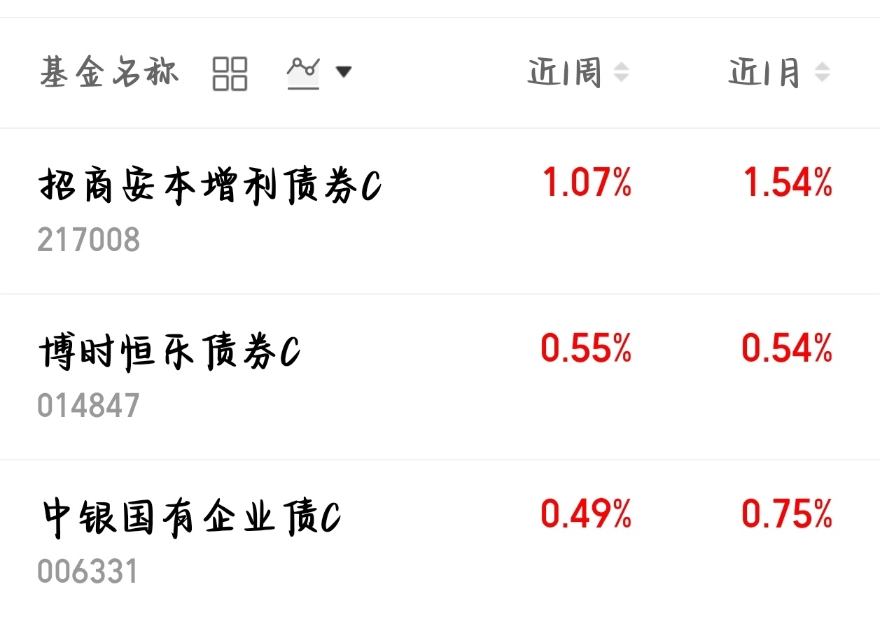 这一周市场起起伏伏,多少固收+扛住了考验$招商安本增利债券C$ 最近一周上涨1.07%,用实力说话。债底扎实、权益增强,震荡市里稳得住、跌得少、回弹快。今年波动只会更大,子弹不多的朋友别瞎折腾,跑来跑去不如守好稳健底仓。安安稳稳拿住,比频繁操作舒服多了,省心又靠谱。