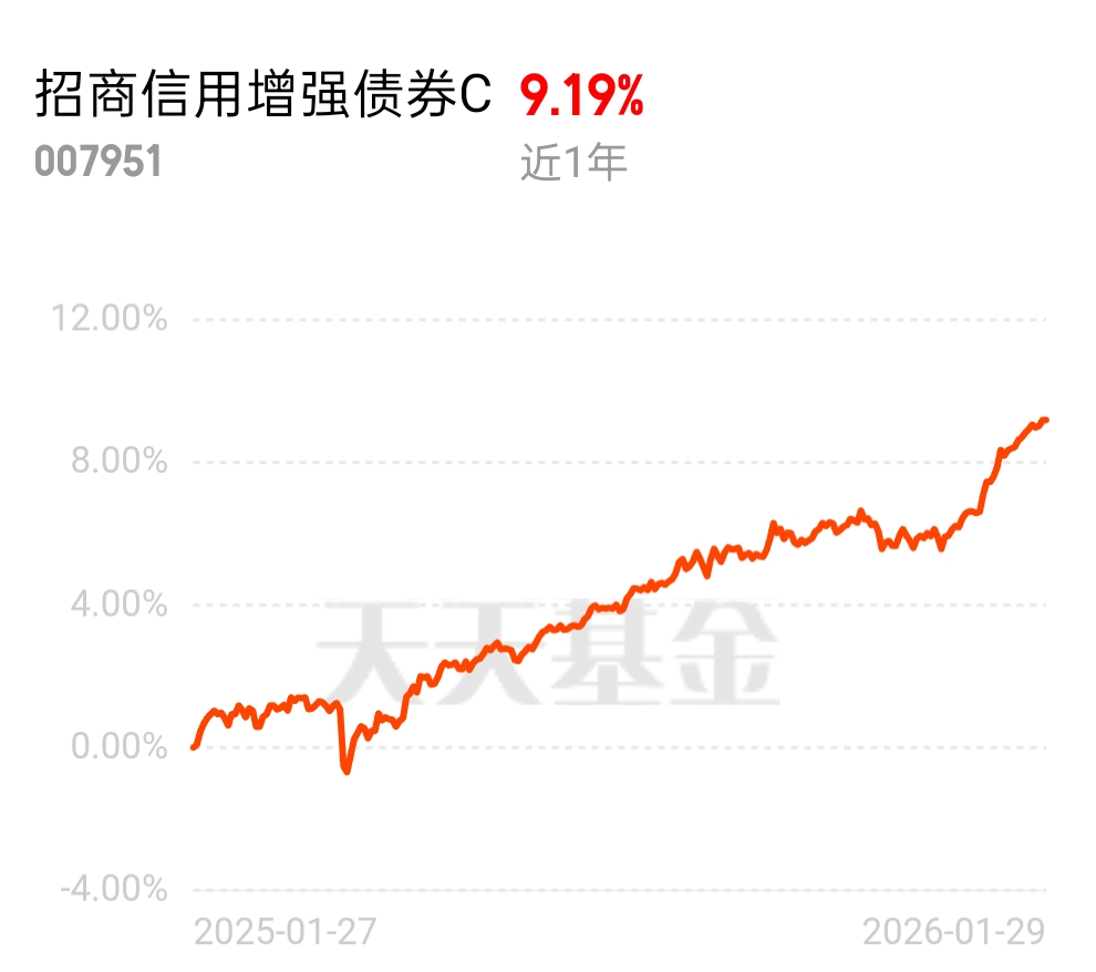 快过年了手里的止盈资金真愁人,放货币基金怕踏空行情,继续放股市又怕把收益亏没了, $招商信用增强债券C$ 是超棒的固收 + 选择,近 1 年 9.19%,昨天还没跌,稳稳的幸福!