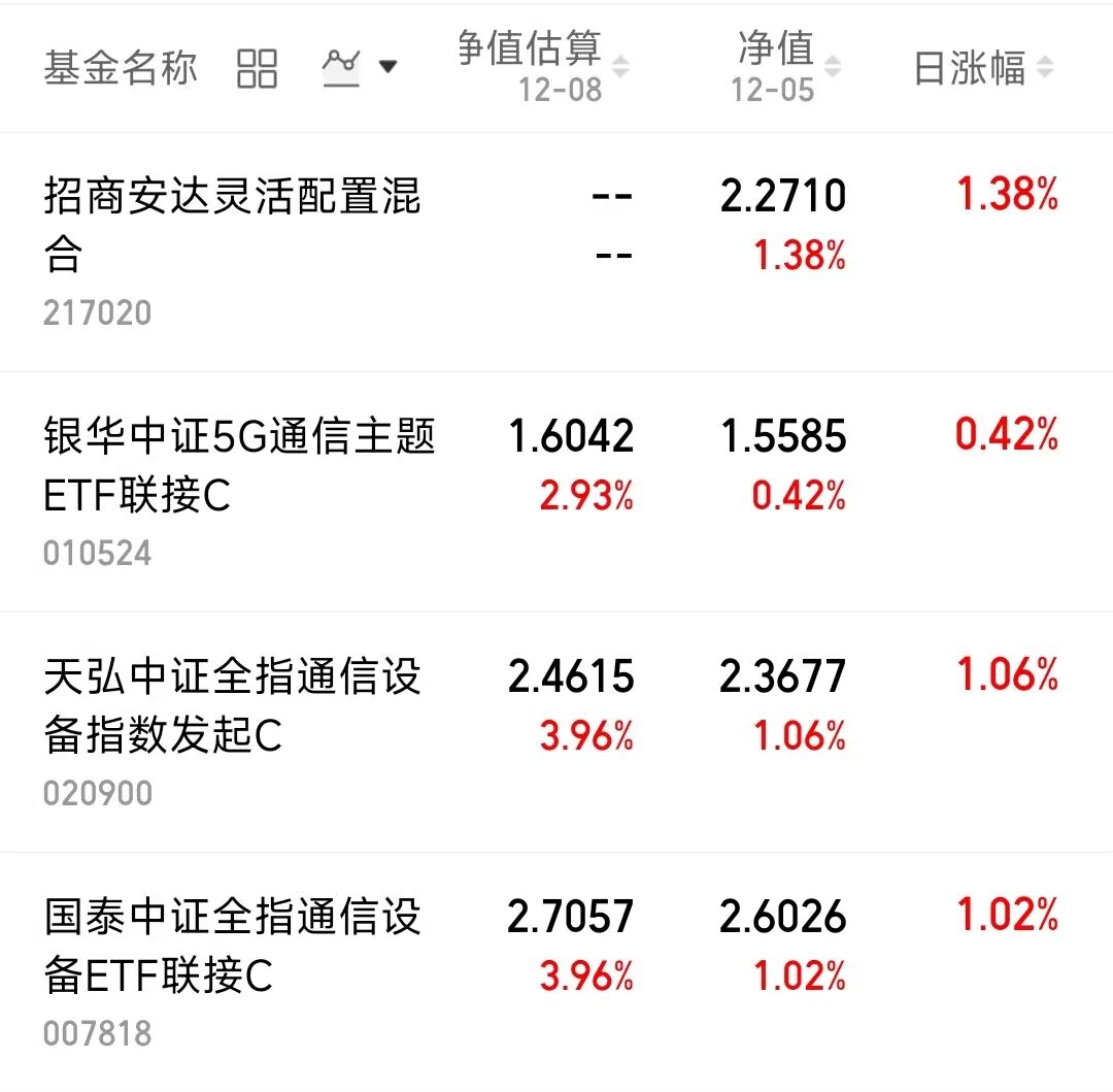 今日在周末利好消息刺激性,行情走势很不错,尤其是通信设备,一路高歌猛进。$招商安达灵活配置混合(OTCFUND|217020)$上周五上周1.38%,$天弘中证全指通信设备指数发起C(OTCFUND|020900)$上涨1.06%,$国泰中证全指通信设备ETF联接C(OTCFUND|007818)$上涨1.02%。