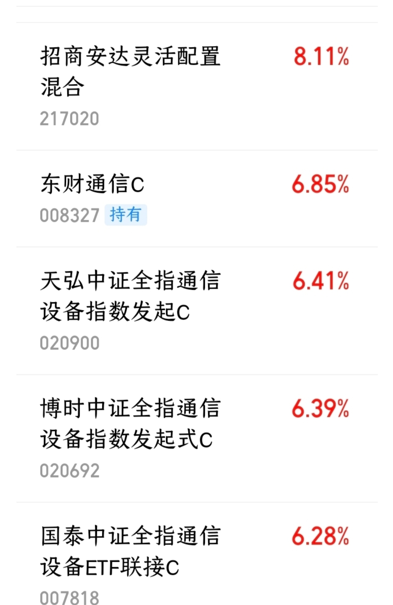 最近市场波动挺大,不同板块轮番表现,但电子类股票整体走势还不错。我注意到CPO、通信这些细分领域最近一周涨得挺好,部分基金也跟着受益。招商安达灵活配置混合主要投的是高科技公司,过去7天涨了8.11%。东财通信C基金最近一周也有6.85%的涨幅。另外博时中证全指通信设备指数基金同期上涨了6.39%。这几个基金都是跟通信科技相关的,最近表现都还可以。
