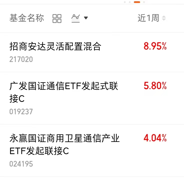 $招商安达灵活配置混合(OTCFUND|217020)$近一周上涨8.95%$广发国证通信ETF发起式联接C(OTCFUND|019237)$近一周上涨5.8%