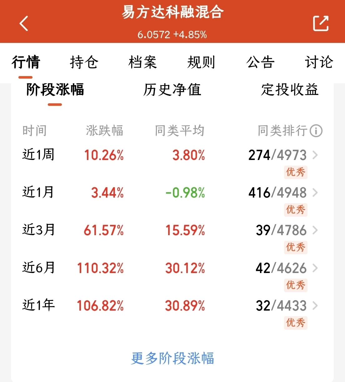 今天股市大涨,科技板块涨幅不错。$易方达科融混合$ 布局科技与新能源,近一周收益超10%,远超同类均值。基金经理经验丰富,近5年业绩排名领先,机构持仓占比达50%,风险收益比高,回撤控制优秀,与当前震荡行情适配性强。