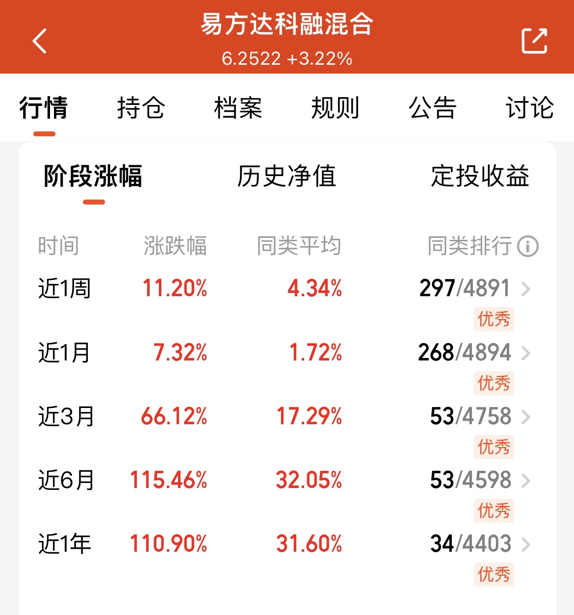 易方达科融混合精准贴合这一行情特点,重点布局光模块、半导体设备、AI应用等高景气方向,持仓既包含基本面扎实的行业龙头,也涵盖成长潜力足的细分领域标的。基金经理擅长把握产业趋势,会根据市场节奏动态调整仓位,在科技板块波动中仍能保持相对稳健的表现,整体持有体验还是不错的。