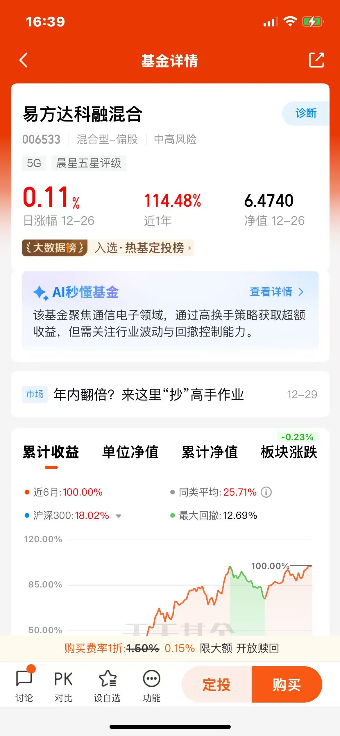 不少主动基业绩都翻倍了;$易方达科融混合(OTCFUND|006533)$这支基金近半年上涨100%真的太强了