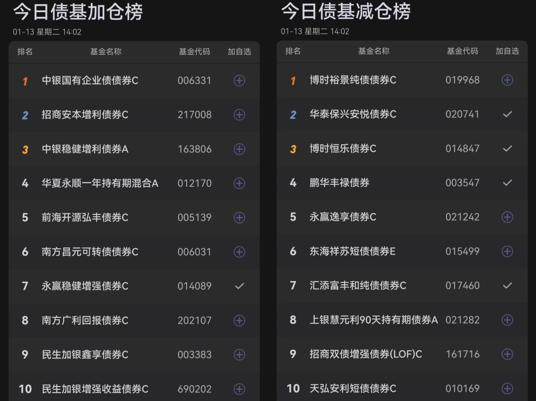 截止14点20分,华子碎8个,南方中债碎1个,方正富邦鸿远碎12个,富国优化增强碎25-35个,中邮恒利碎15-25个,鹏华双债收5~-5个,博时恒乐收10-20个,永赢稳健碎5-15个,最终数据已17点收盘为准。