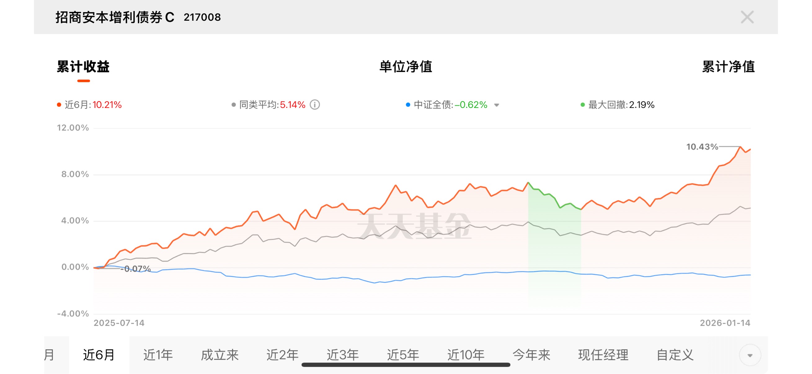 理财市场越来越卷,稳健又能赚钱的产品不好找。$招商安本增利债券C$ 近 6 月 10.21% 的收益很实在,专业团队运作,风险可控,闲钱投进去不用愁,收益自然来。