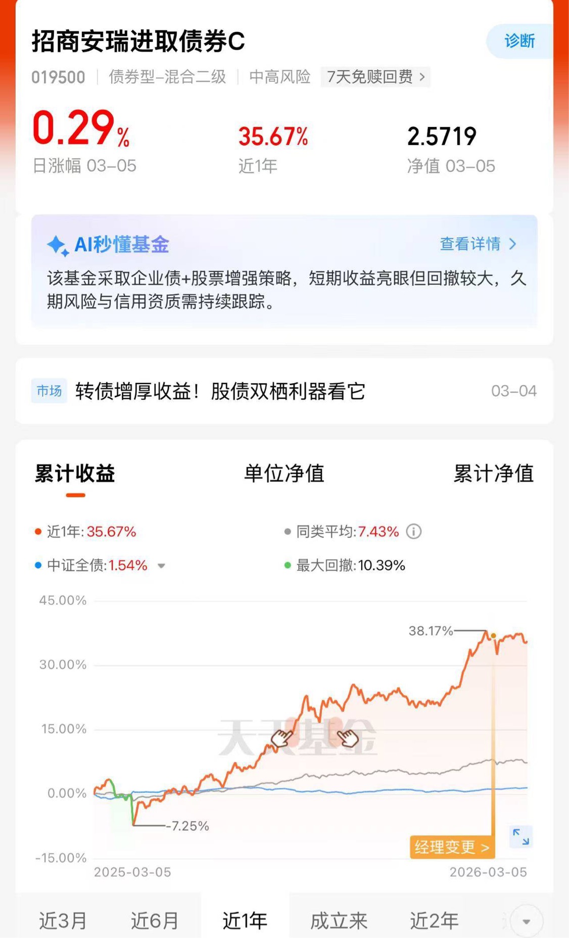 行情捉摸不透,稳住心态比啥都强。招商安瑞进取债券C,可转债增强的高波固收+,昨天