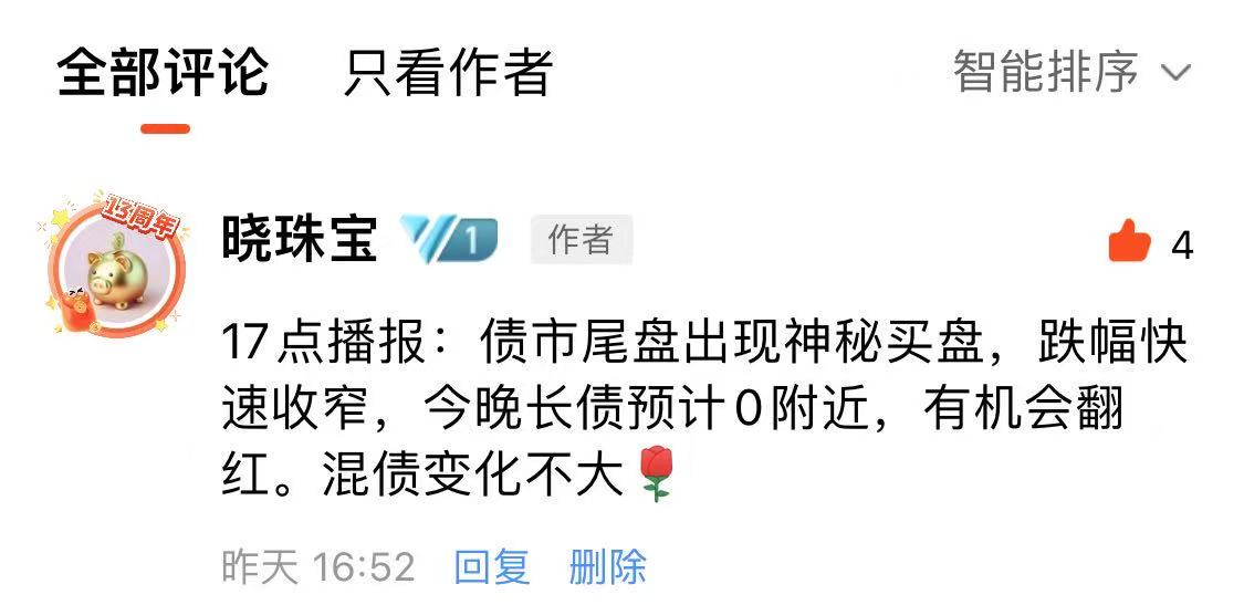 注意,如果播报后,债市尾盘拉升或者跳水,17点左右我会在估值帖子的评论区更新情况。