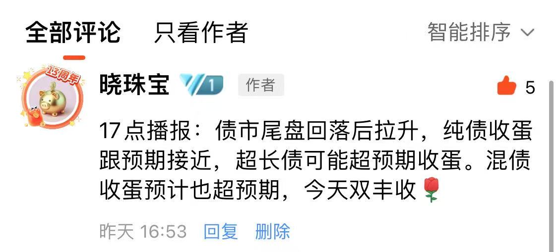 注意,如果播报后,债市尾盘拉升或者跳水,17点左右我会在估值帖子的评论区更新情况。