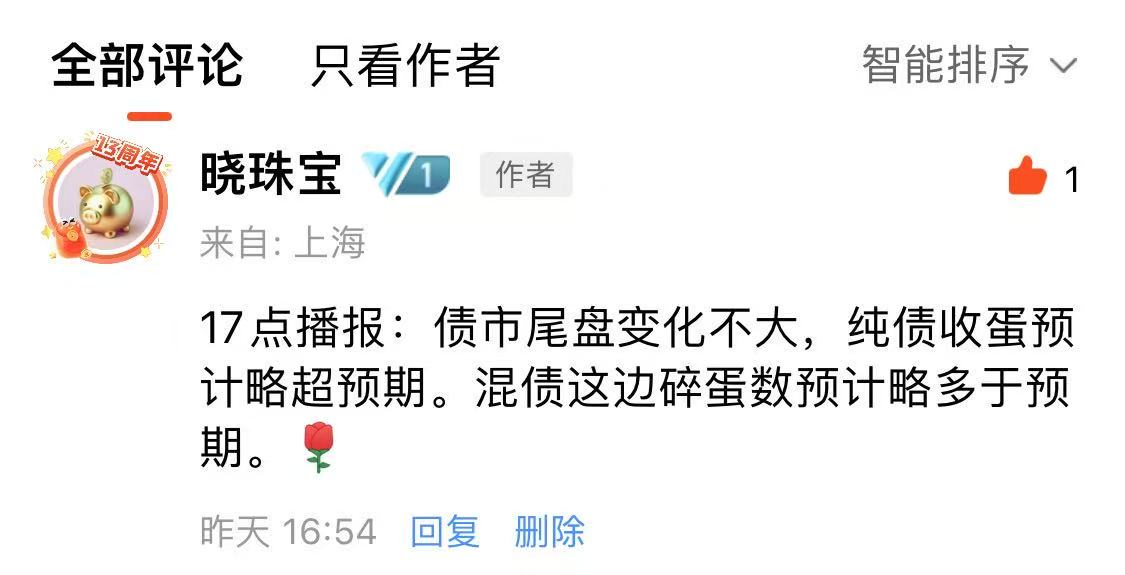 注意,如果播报后,债市尾盘拉升或者跳水,17点左右我会在估值帖子的评论区更新情况。