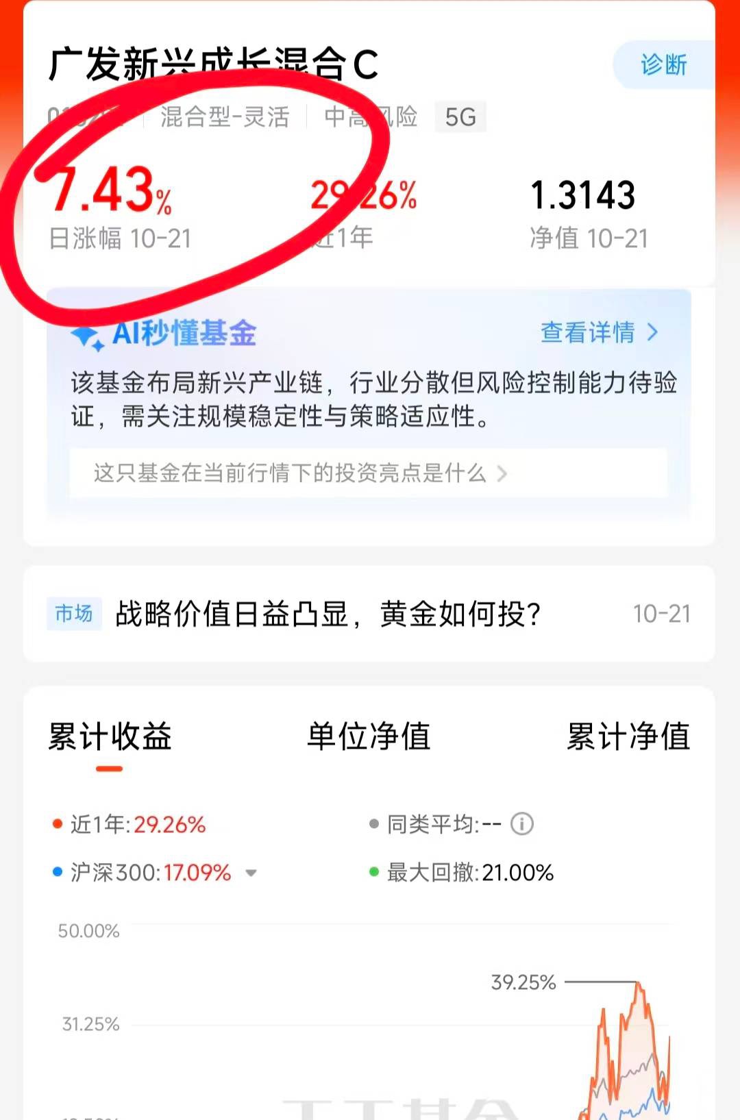 真够可以的$广发新兴成长混合C$上周别的持仓吐出来的这只全赚回来了!7个点,我继