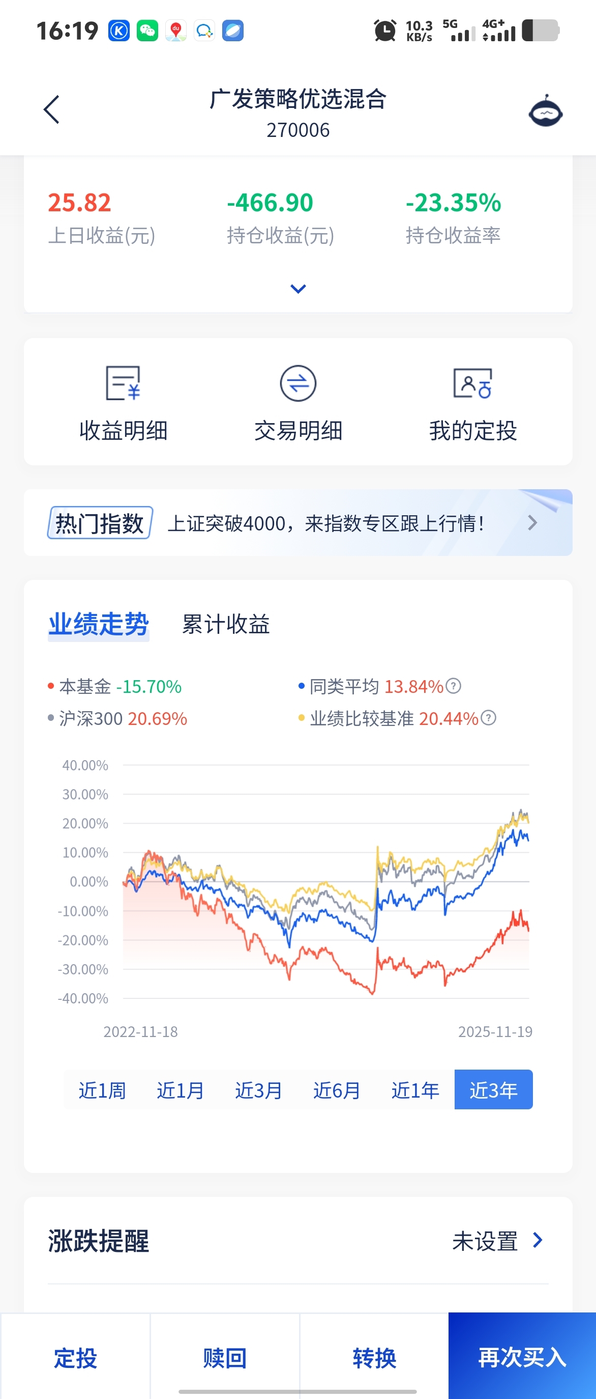 $广发策略优选混合(OTCFUND|270006)$ 大概在大盘3200点买的这玩意,时间应该是3年前.现在居然还亏23%.是不是很可笑?钱不是自己的没人在意你们的收益,远离基金。
