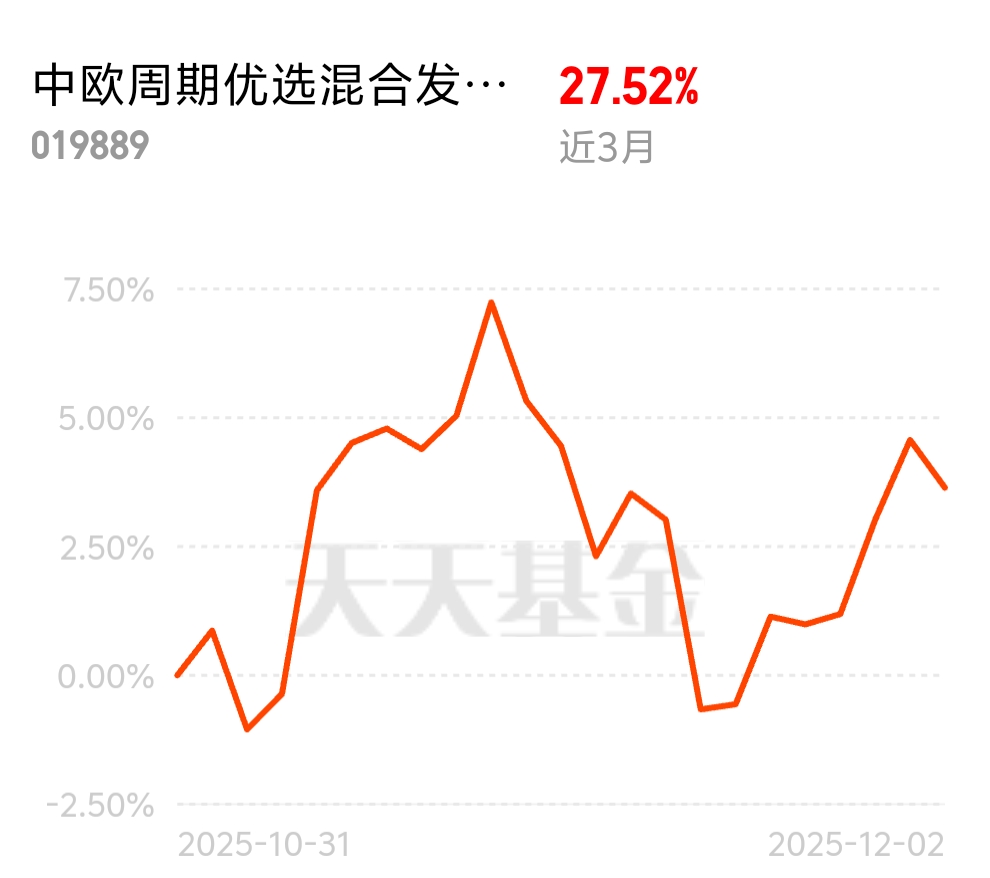 制造业 PMI 回暖信号明确,工业金属需求逐步复苏,周期板块迎来配置窗口期。中欧周期优选混合发起 C 近 3 个月 27.52%,重仓龙头股不踩雷,涨多跌少,在同类里表现拔尖,现在上车正当时。