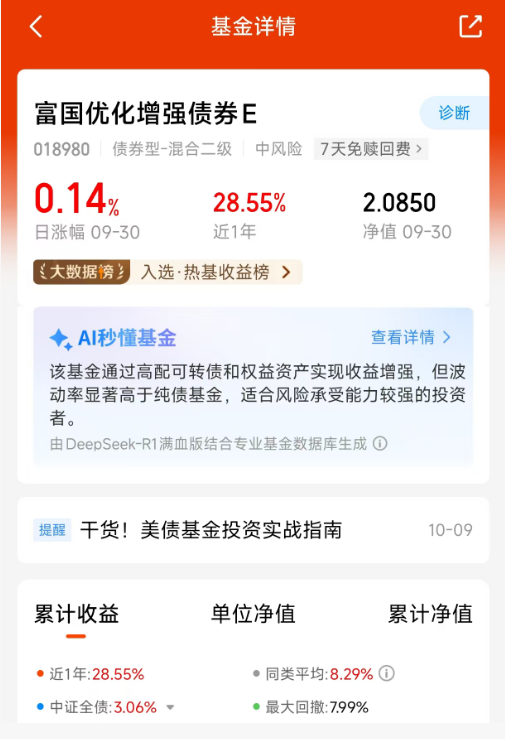 现在行情的问题是什么,一个是板块轮动快,热点不好抓,另一个就是涨的突破很多人的认知,认为会调整。有这两个想法,我觉得$富国优化增强债券E$(018980)这种就更适合你。看上去是债基,实际有挺高的权益仓位,近一年涨了快30%,主要就是创新药和科技的主线抓的好,最关键是还有4成纯债仓位打底,波动小,最大回撤不到8%,这种产品弹性和稳妥兼备,进可攻退可守,是真正适合当前拿着的。#指数操盘手集结令#