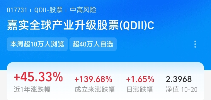 最近海外市场也回暖了,$嘉实全球产业升级股票发起式(QDII)C$ 也表现很不错啦!净值+1.65%,近一个月涨5.91%,近三个月涨超26%,领先同类基金,全球化布局各科技龙头,成长性大!长期持有投资回报率高,可以长期持有!