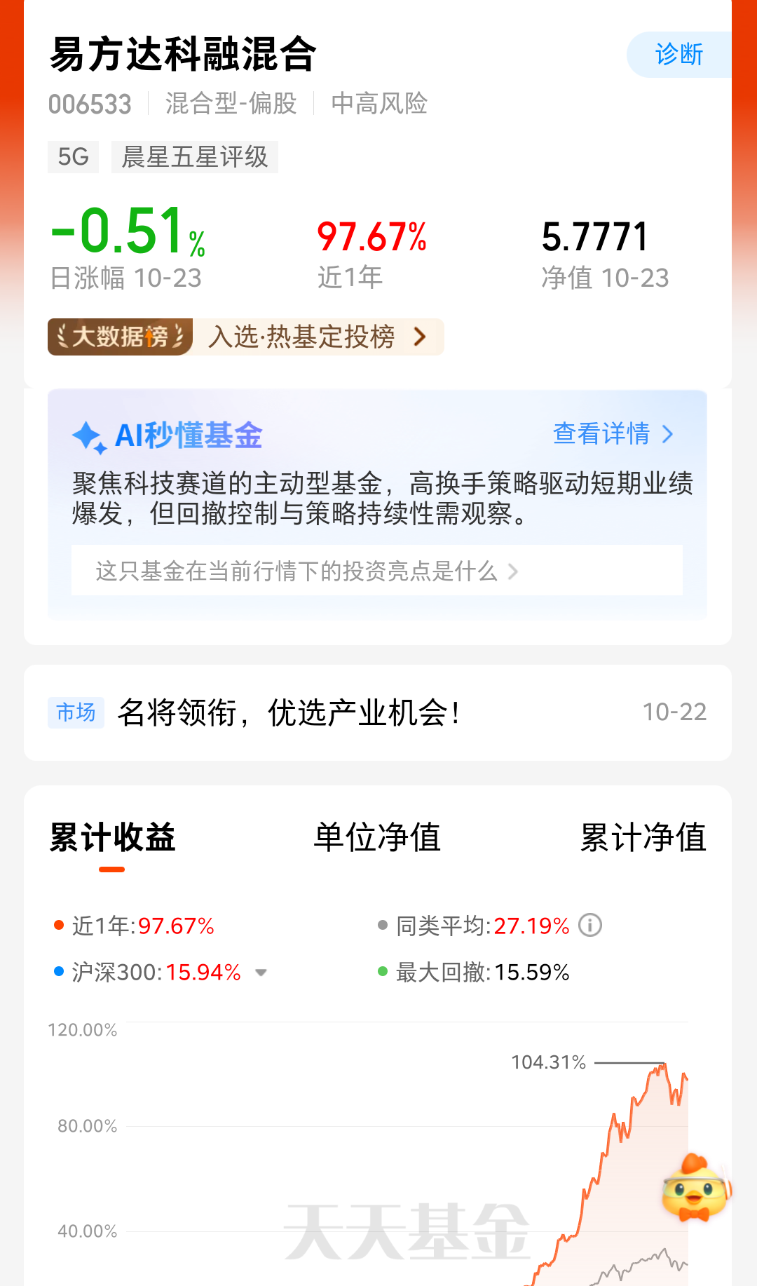 最近科技板块涨势不错,但是细分板块多,相比单一赛道,还是均衡配置的更有优势,比如易方达科融混合混合,不仅买了科技,还买了反内卷相关的新能源相关的,深度参与科技、新能源、军工轮动配置,夏普比率优秀,可以说是成长里的均衡之选。