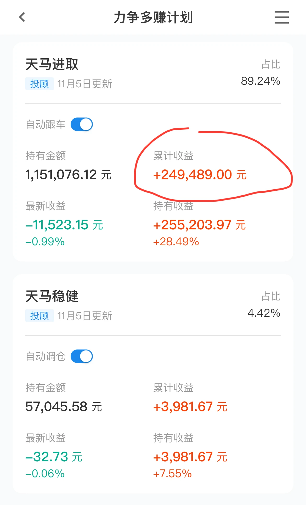 截止昨天,我的个人实盘,天马进取盈利24.9万。