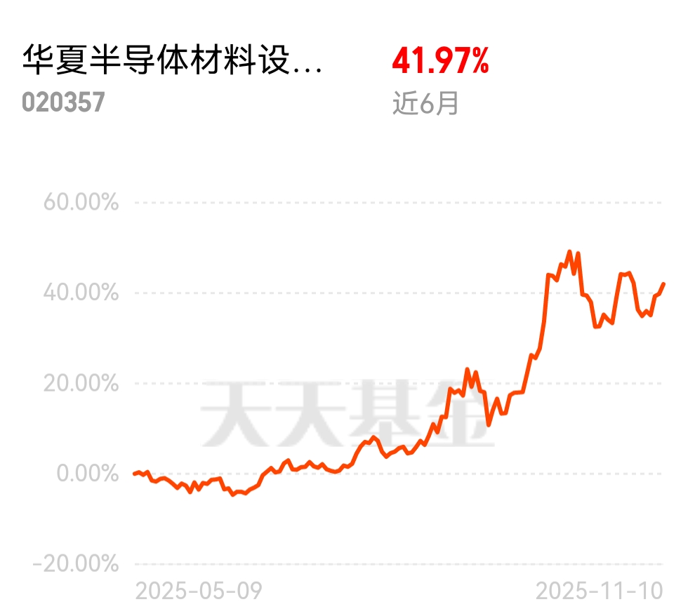 估值便宜了就补仓,继续布局,三个月涨超35个点,半年涨近42%,半导体的爆发力我是看好的,现在科技自主是大趋势,放心加仓,场内近3月业绩近40%,近6月近47%,在7月以来半导体材料设备这波行情中表现更好$华夏半导体材料设备ETF联接C$