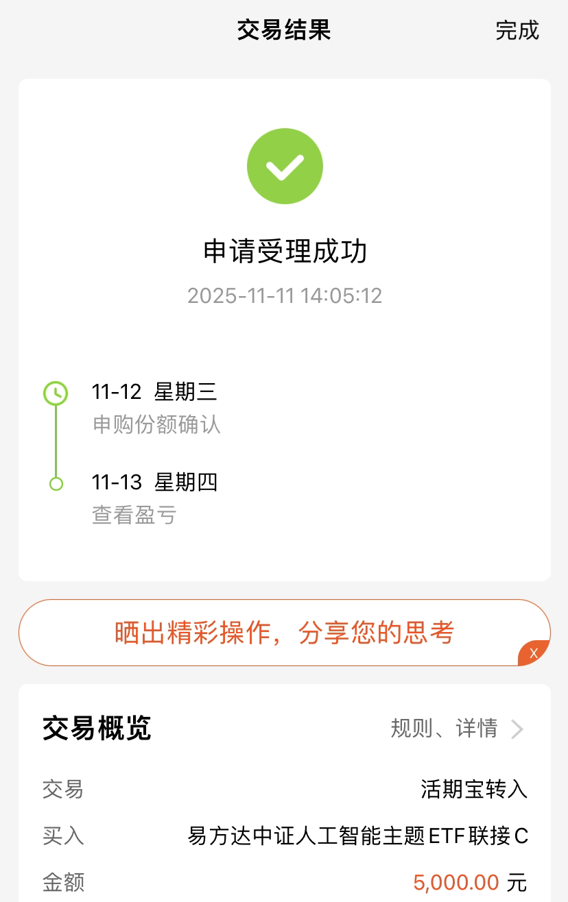 时大盘围绕 4000 点震荡,板块轮动频繁,资金在顺周期与科技成长股间切换。人工智能受政策与产业端双重重视,AI + 行动推动多领域智能化改造,人形机器人、大模型等场景落地加速,长期发展逻辑清晰。易方达中证人工智能主题踩中核心赛道,近三月涨 35.83%、近一年涨超 53%,各阶段业绩亮眼。现在大盘调整正处低点,我打算趁机补仓,坐等反弹~