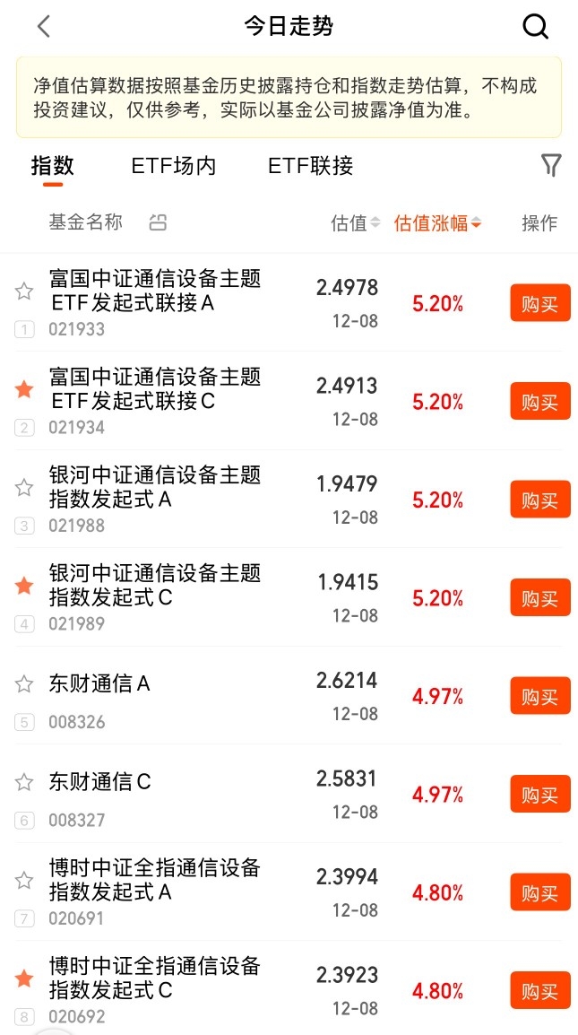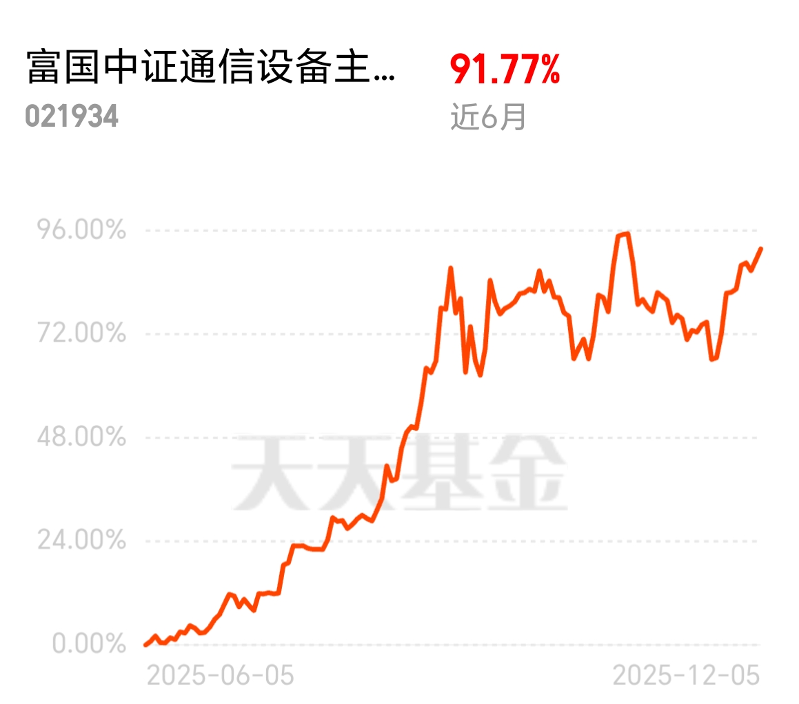 目前广发纳斯达克100ETF联接A一直回条,反而让更关注手里配的富国中证通信设备主题ETF联接C它重仓中兴通讯、中际旭创,还是全市场这两只股持仓最高的;成分不只有CPO龙头,还覆盖军工通信和卫星互联网,双重逻辑加持。近1个月涨了8%,近6个月冲到92%,今天基金预估大涨,在同类里面领先。成分公司这个季度赚的钱比上季多了11%,估值也比过去五年28%的时间都低。今天基金预估大涨,在同类里面领先,配置起来心里稳扎稳打不少。