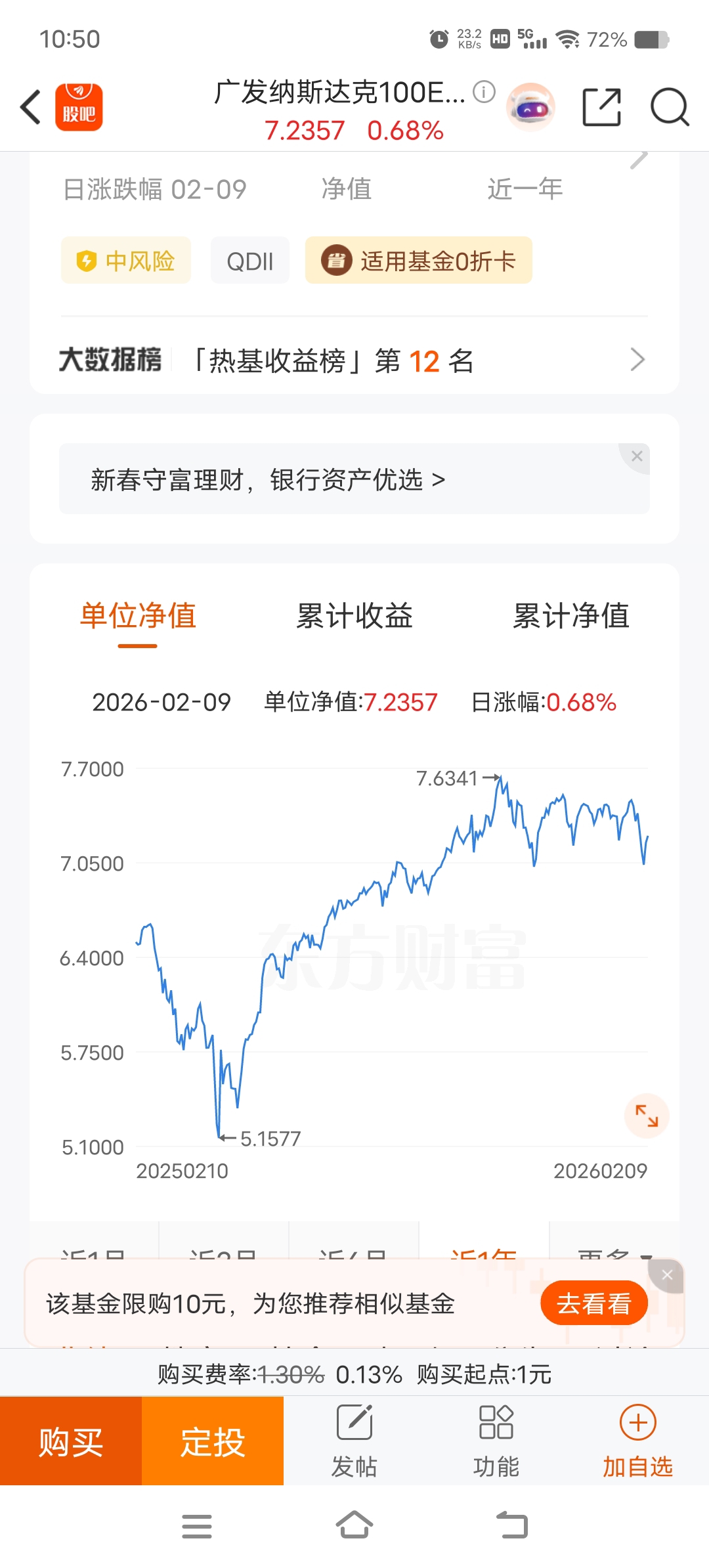 $广发纳斯达克100ETF联接人民币(QD(OTCFUND|270042)$ 广发全球精选昨天比这里多涨1个多点,重仓美股的同时也配置了全球其他的优质公司,弹性更大
