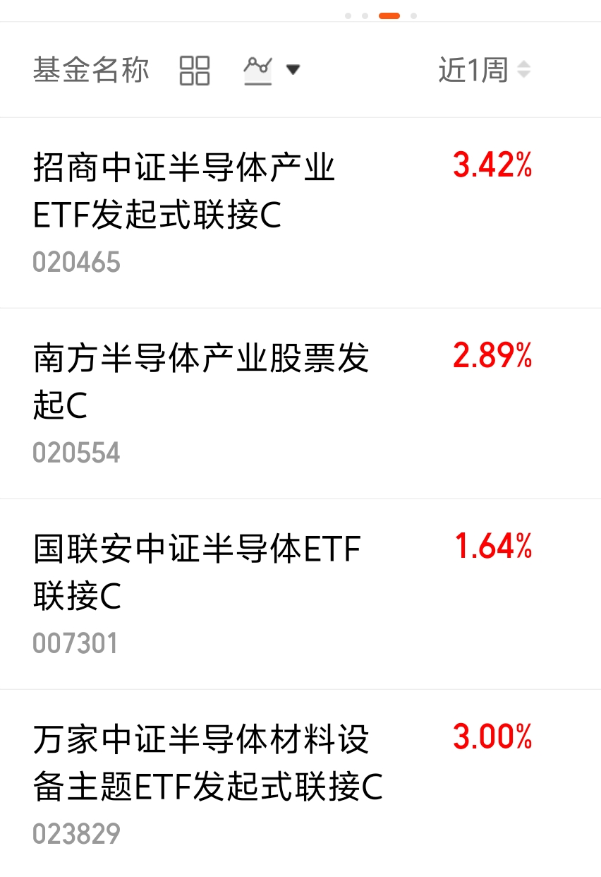 大盘近期波动比较大,各大板块轮动很快,半导体板块近期表现还不错,$招商中证半导体产业ETF发起式联接C$ 近一周涨了3.42%,长期来看发展前景还不错,看好这个方向!