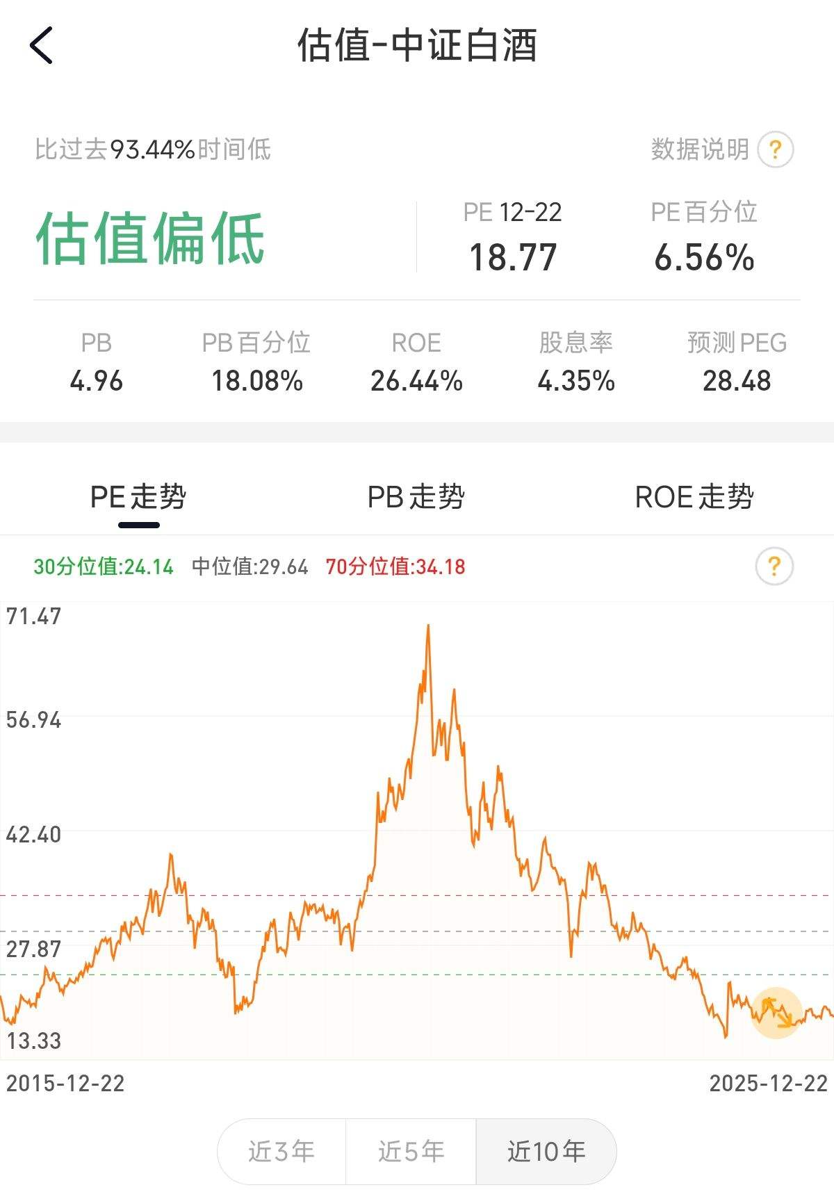 白酒,下面是白酒基金$招商中证白酒指数(LOF)C(OTCFUND|012414)$跟踪的中证白酒指数最近10年的最新指标,中证白酒股息率已经来到了4%,估值低于历史上90%以上的时间了,所以我大概率还是会每日小额定投持续一年左右。