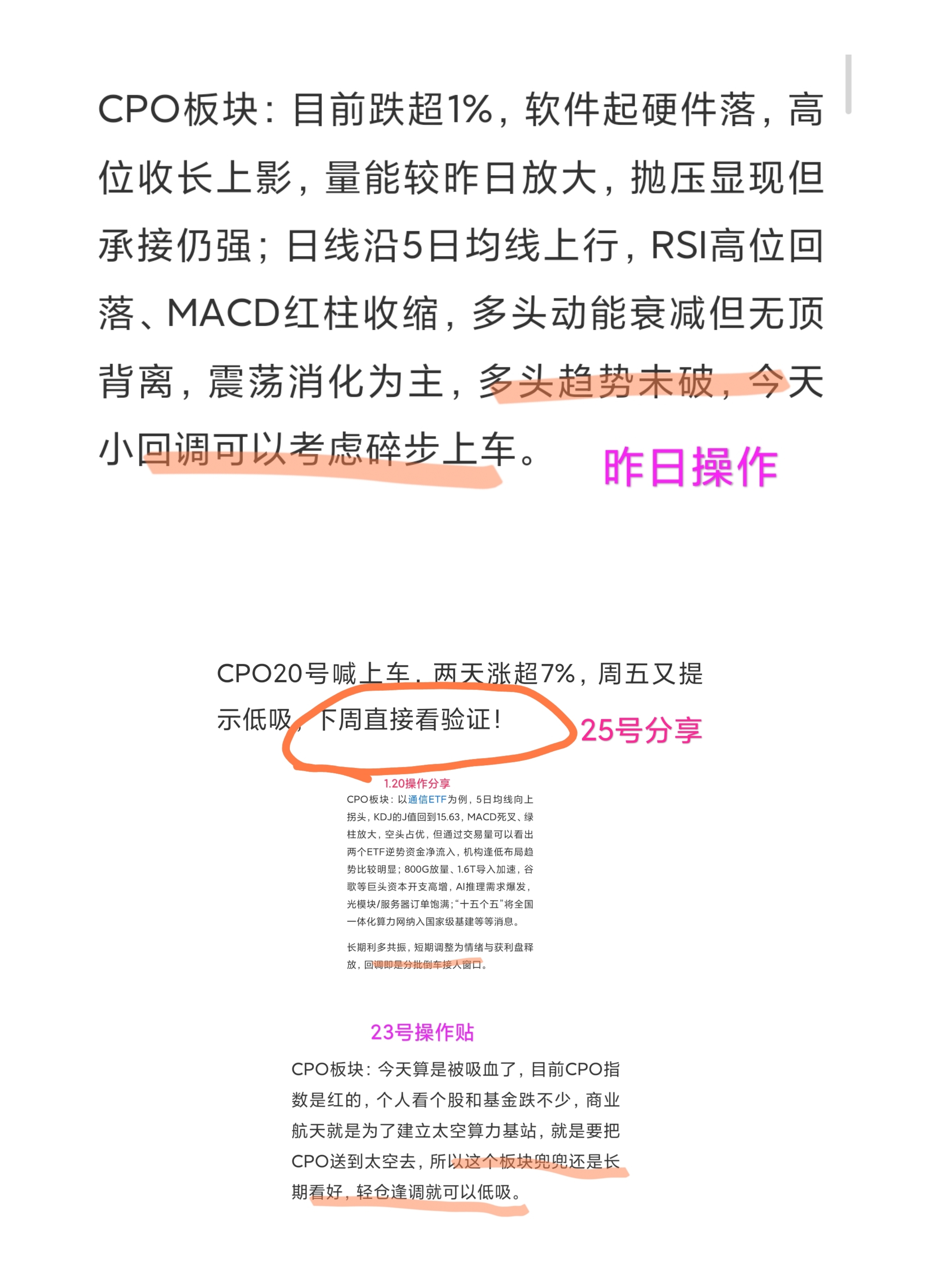 CPO在20号喊大家上车,短短两天就大涨超7%。上周五其他板块一片飘红,CPO却逆势大跌,兜兜当时就直言这是“倒车接人”的绝佳机会,周末更是大胆预言下周见分晓。哪怕市场三天巨震又能怎样?CPO还不是逆势大涨!周四CPO回调,兜兜果断喊出“逢跌低吸”,你看今天CPO午后强势拉升,截至收盘,杰普特、致尚科技20%涨停,炬光科技涨近17%续创新高,太辰光、天孚通信等涨超10%,新易盛涨近7%,中际旭创涨近6%。这波操作,直接给出最硬核的答案!近期每一步操作都精准踩中节奏,晚间CPO老大老二更是交出完美业绩答卷,大超预期!