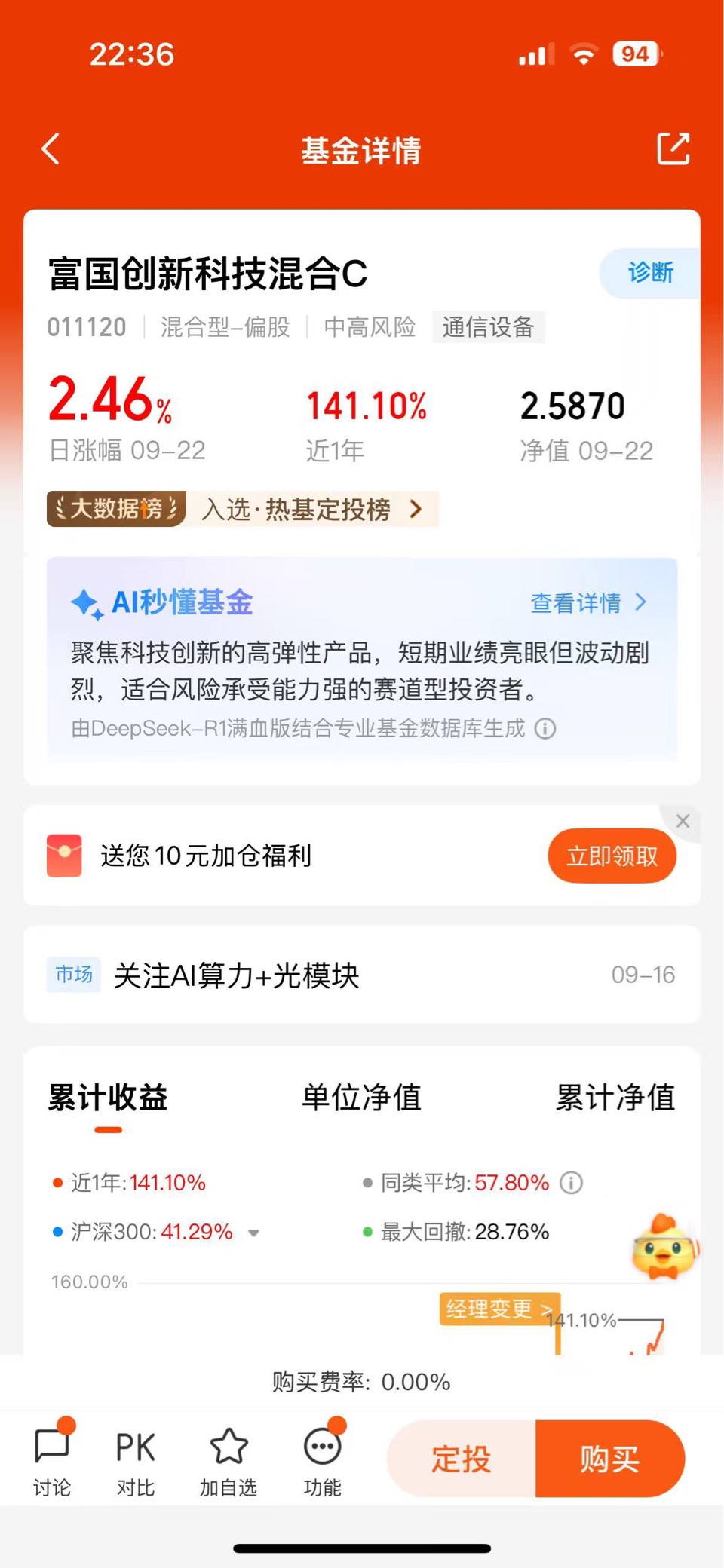 $富国创新科技混合C$ 富国创新科技日净值2.46%优势不错,近3月同类排名第一,而且重仓CPO,这波行情走势直接拉满,坐等收益爆涨