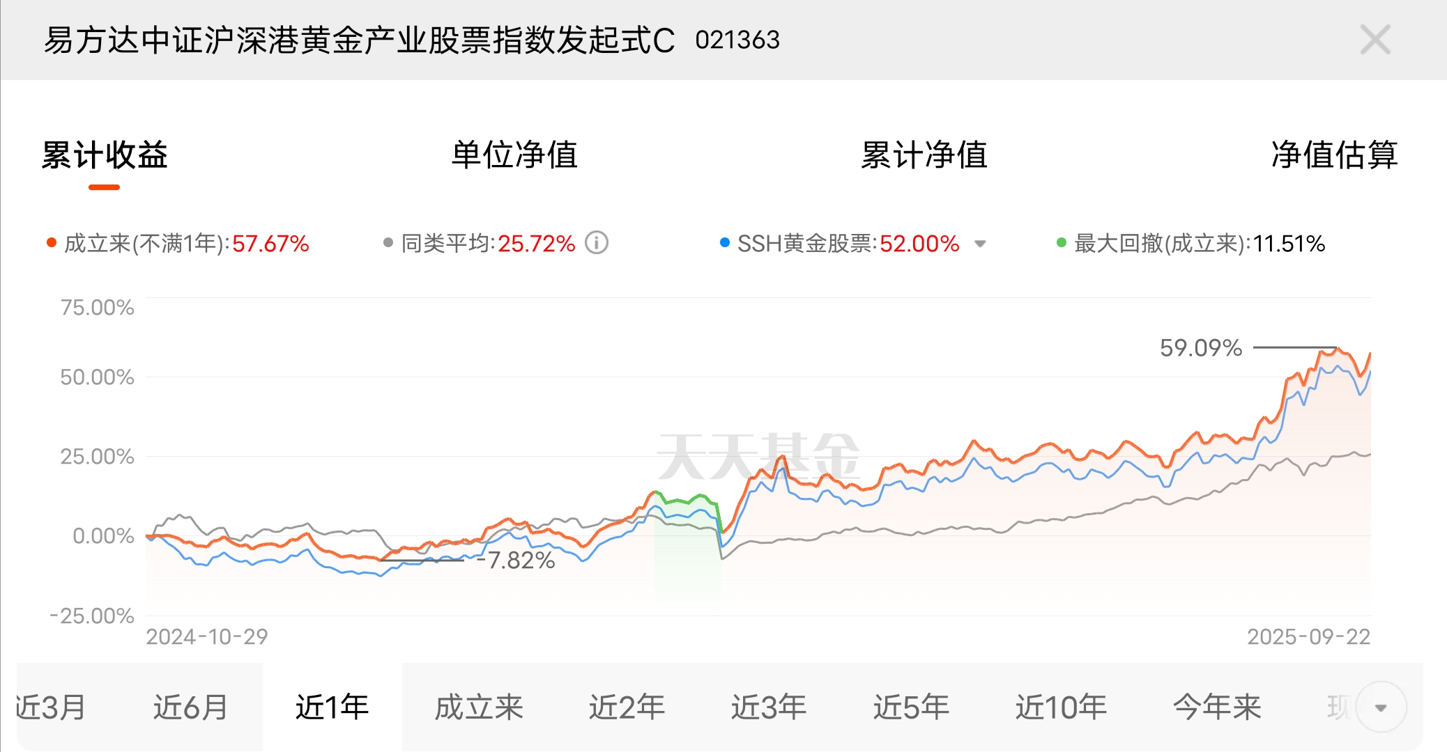 最近留意黄金基金表现,易方达中证沪深港黄金产业指数C很突出,近1月涨20.99%