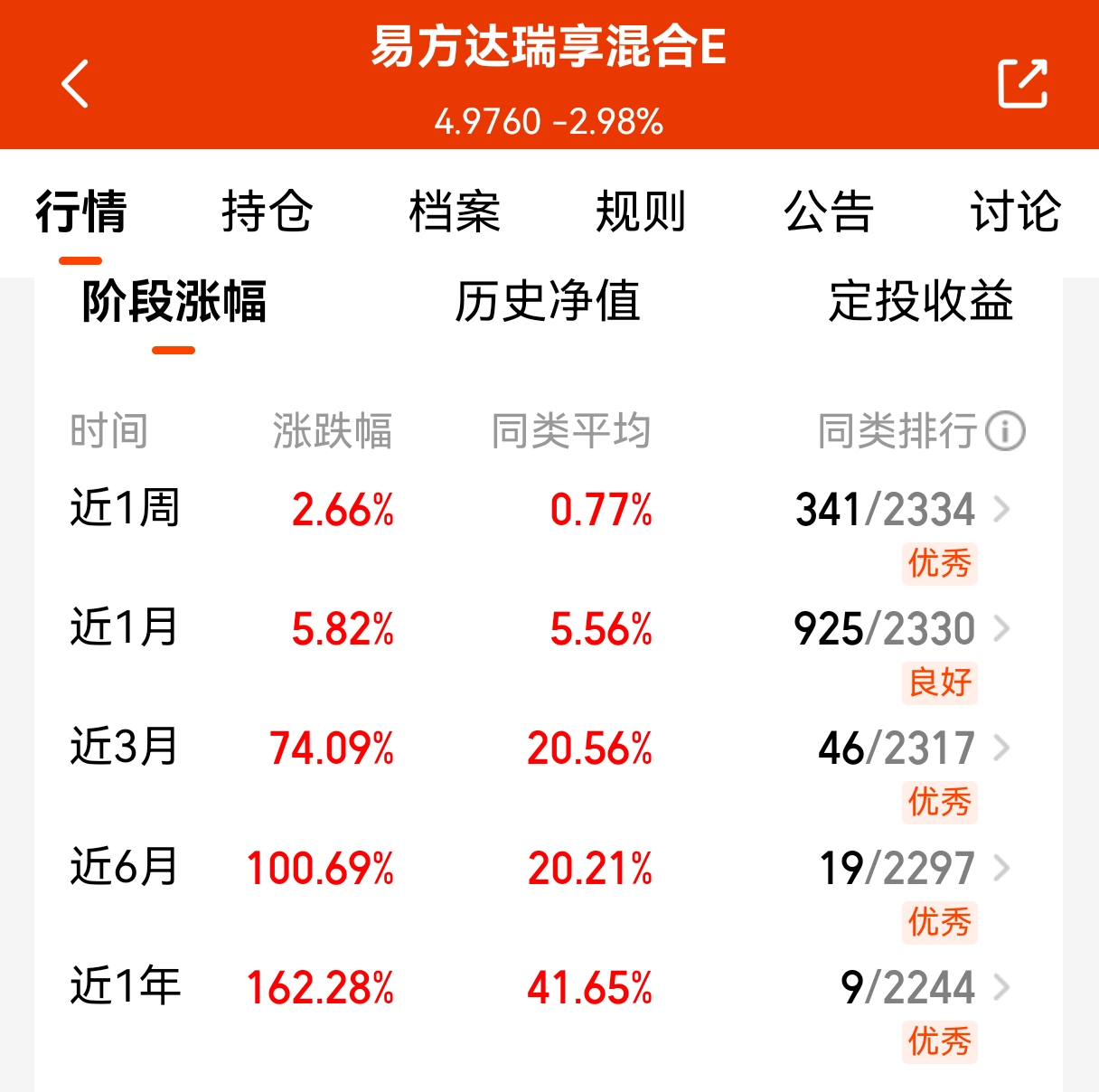 科技今年是真牛的,走势一直向上,每次拉都是拉科技,CPO行情今年涨了不少,$易方达瑞享混合E(OTCFUND|001438)$表现就很优秀,近一个月涨幅5.82%,近三个月涨幅74.09%,近一年涨幅162.28%,经理能力真好,这一波行情踏得跟准,过往调仓很坚定、效果很好。