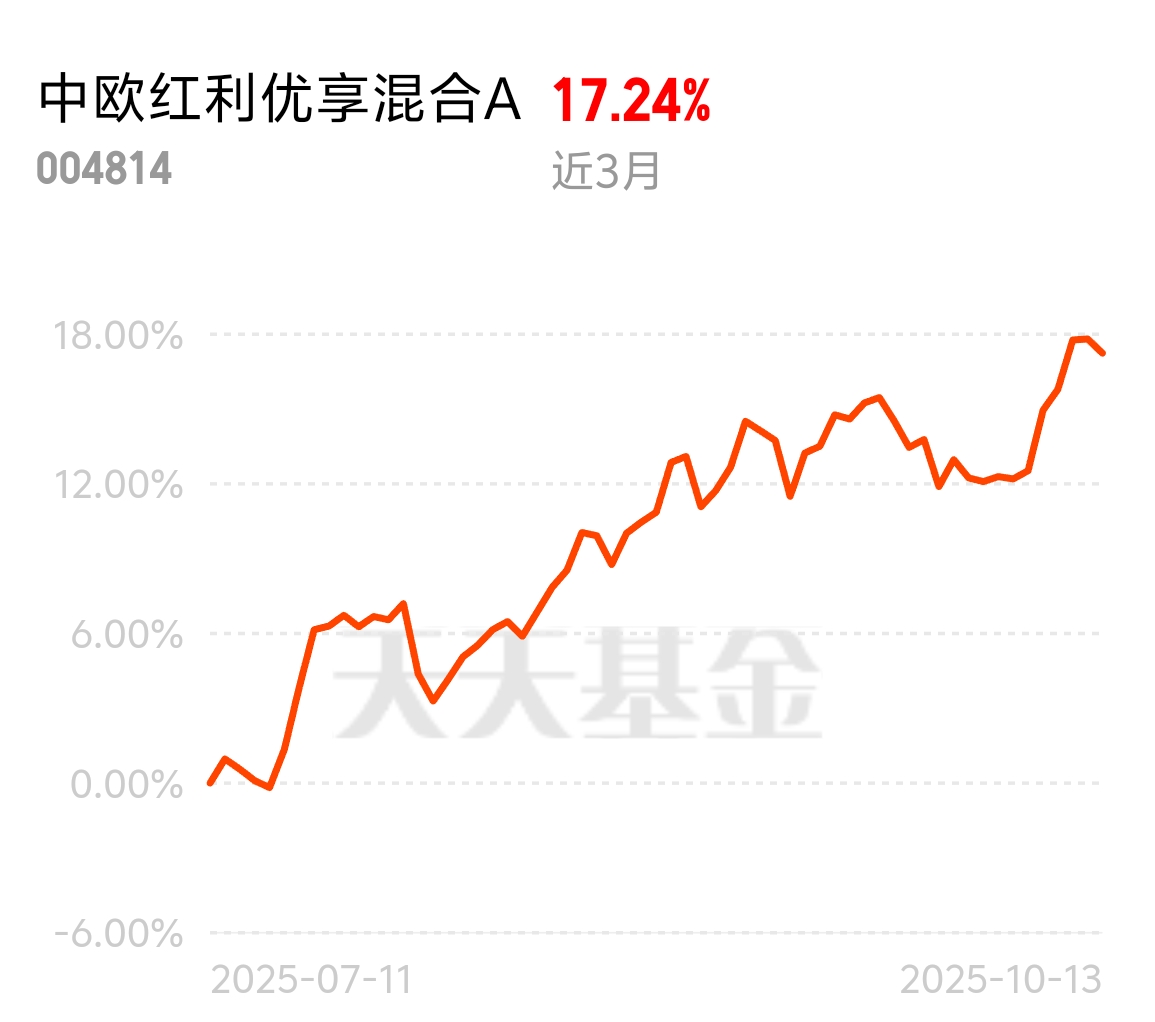 这会儿行情真不稳,涨涨跌跌没个准头,中欧红利优享灵活配置混合A却稳得一批。近3个月涨了17.24%,帮我对冲了不少亏损。建底仓选它太合适,今天买5万,详情页领16.88元红包,划算又省心,波动比科技基小。