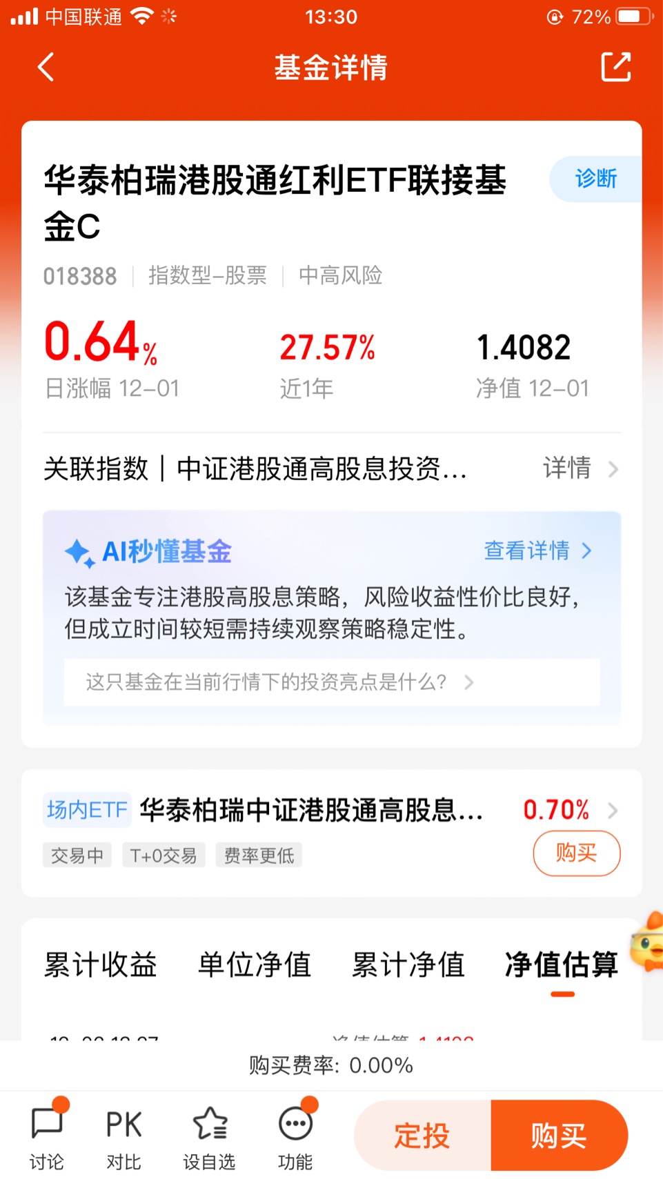 今天红利行情太给面儿了!港股高股息板块集体发力,现在市场里“稳字当头+能拿分红”的标的真的吃香。这时候选华泰柏瑞就很合适——它就是盯着港股高股息做的,今天行情一好它也跟着涨了点,近一年收益也挺拿得出手。而且现在买不用掏手续费,对于咱们普通投资者来说,不用折腾场内ETF,直接选这个跟红利行情的产品,既能沾赛道的光,又省事儿,挺实在的!$华泰柏瑞港股通红利ETF联接基金C$ #青禾创作计划#