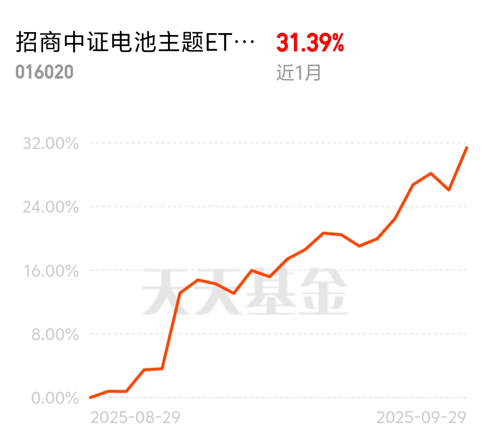 昨天电池板块又冲一波,今天指数持续强势。这指数覆盖全产业链,龙头多,招商中证电池主题ETF联接C近1个月31.39%,值得关注。