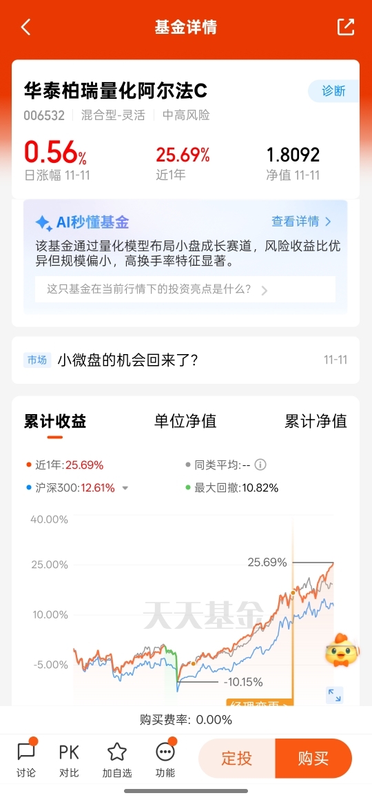 有没有觉得11月的市场有点“猜不透”?科技股涨不动了,其他热门板块也没形成气候,反而小微盘悄悄崛起了。主要是现在宏观叙事真空,资金没地方去,就扎堆到题材丰富的微盘股里,这也让11月小微盘的胜率大幅提升。选基金的时候,我最看重两点:收益和风控,华泰柏瑞刚好都满足。它家量化产品近三个月收益比同类微盘基金都高,而且最大回撤还更小,说明团队不仅会赚钱,还会守钱,在当前的市场环境下,这样的基金才让人安心持有。