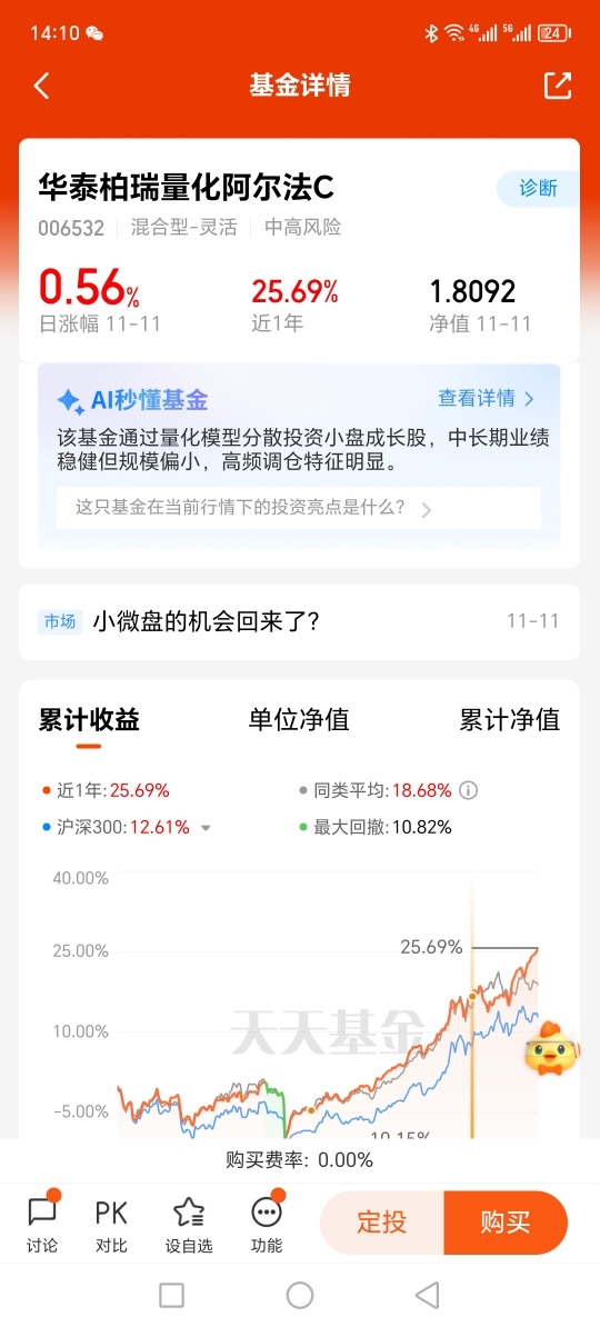 最近身边买小微盘的朋友都赚笑了!你们看行情没?小市值的票连着突突了好几天,今天稍微回踩了一下——这可不是跌,是给咱们留上车位呢!刚好我关注的华泰柏瑞,就是吃这波小微盘红利的!它前阵子跟着行情连涨8天,今天跟着回调了点,这不就是“时机到了”?这基专门投小盘子里的成长股,调仓还挺灵活,最近这行情踩得死死的,我觉得现在入手刚好能蹭上这波小微盘的热度,你们要不要一起瞅瞅?$华泰柏瑞量化阿尔法C$ #4000点 到底要不要止盈?#