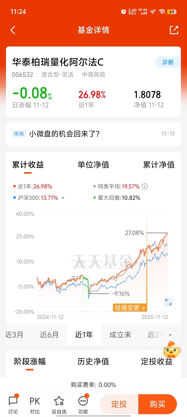 不得不说,今年量化微盘的表现太超出预期了!在市场波动加大、风格轮动加快的环境下,微盘策略反而如鱼得水,因为这种行情正是量化模型最擅长的。资金都在往这个方向涌,毕竟微盘股和大盘相关性低,能分散风险,还能靠短期波动赚收益。选基金就得选专业的,华泰柏瑞的量化产品可不是吹的,近三个月收益直接领跑同类热门产品,回撤还比别人控制得好,真正做到了稳中求进。它家靠周度周期策略抓机会,既避开了高频交易的高成本,又比中长期模型更灵活,刚好适配微盘股的特性,普通人跟着投,相当于把钱交给专业团队打理,省心又放心。#11月基金投资策略#
