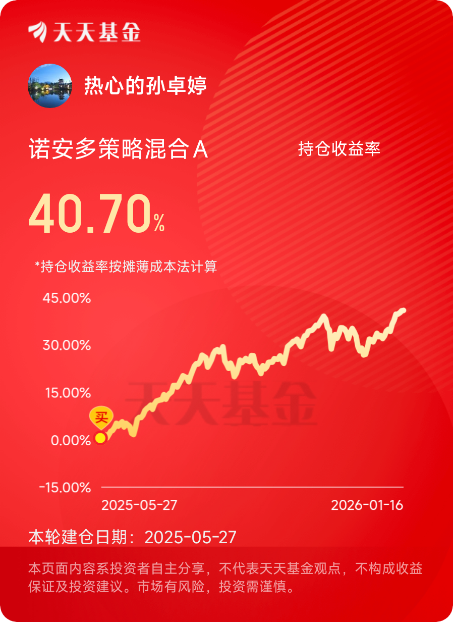 半载栉风沐雨,基金的稳健表现让我深知,每一份收益都源于您对周期的深刻洞察与对风险的敬畏之心。我愿以长期主义为伴,与基金共赴时光之约,亦坚信在您的专业领航下,诺安多策略混合A将在时代浪潮中续写华章,让价值在坚守中绽放更璀璨的光芒。