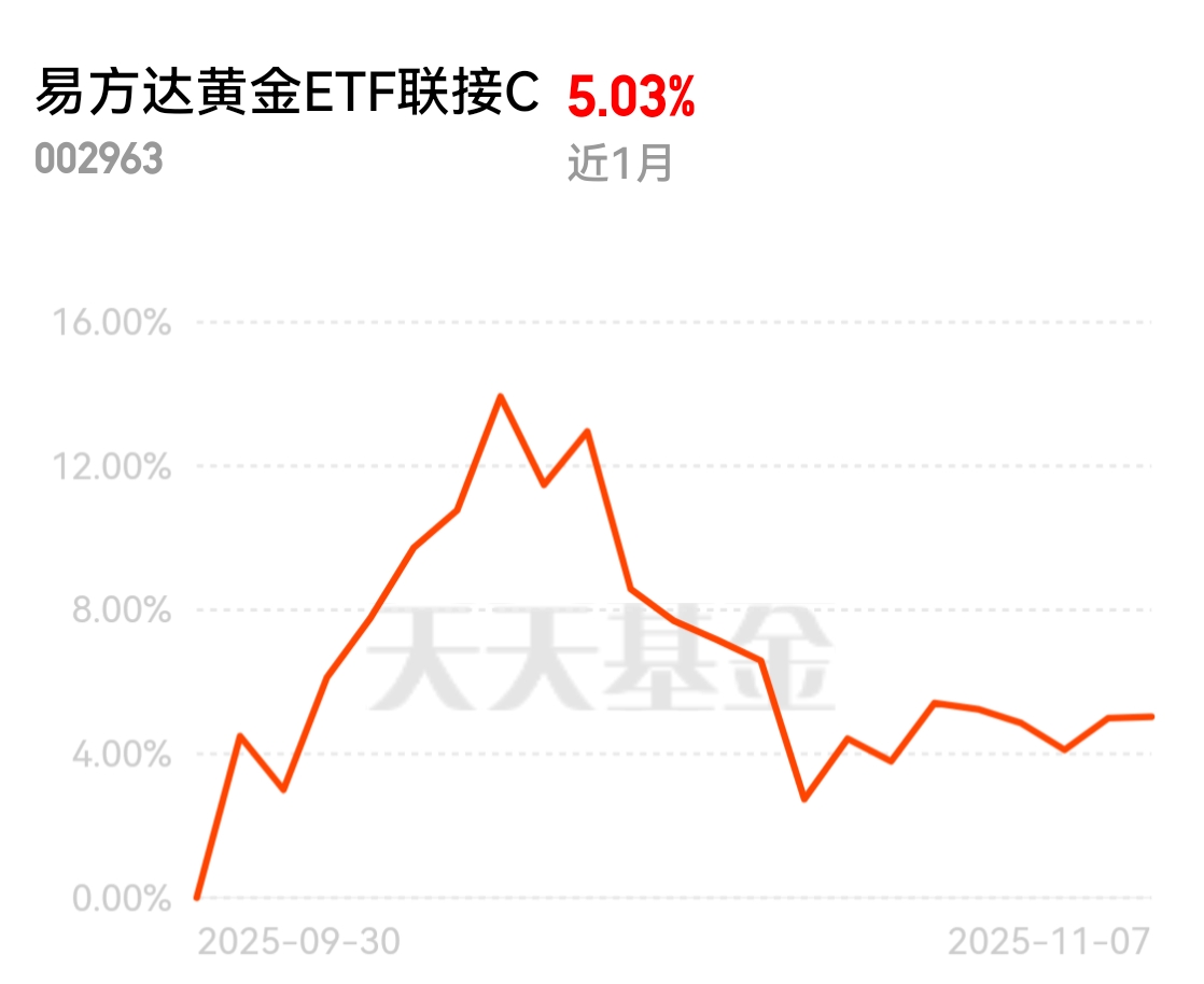 现在全球经济不确定性挺高,大家都想找稳妥的投资方向,黄金作为硬通货一直很吃香。易方达黄金ETF联接C就很给力,近1个月涨了5.03%,不用操心实物黄金的储存和变现,普通人用少量资金就能参与,想稳妥配置资产的可以多关注。 $易方达黄金ETF联接C$