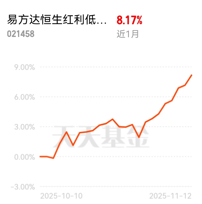 现在市场震荡得厉害,大家都想找稳当又能赚钱的标的,港股红利低波板块就挺吃香。易方达恒生红利低波联接C近6个月涨了19.09%,费率还比摩根、天弘、富国那些同类型产品低不少,低费率加稳收益,普通人布局港股红利选它很划算。
