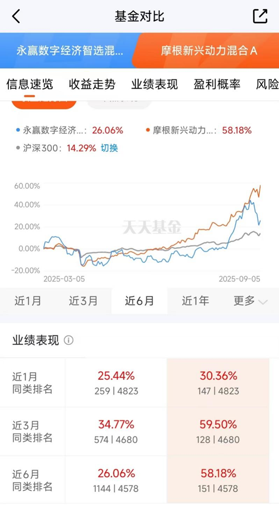 拿最近挺火的永赢数字经济(018123)对比下,差距就出来了。永赢近3个月收益34%,**摩根新兴动力接近59%**,直接碾压25个百分点!更别说风险控制了,永赢最大回撤6.66%,摩根只有2.65%,这稳定性没谁了!