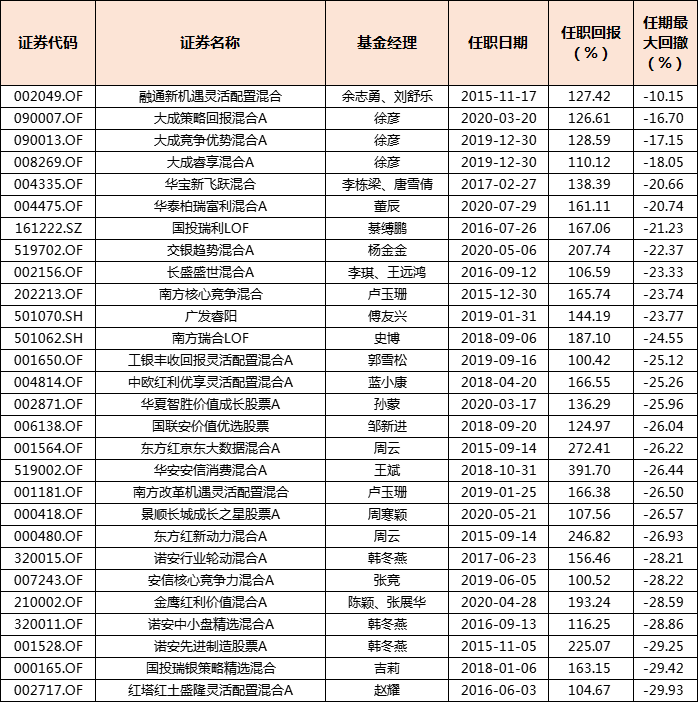 如果再把任期最大回撤考虑在内,有28只将最大回撤控制在-30%以内。