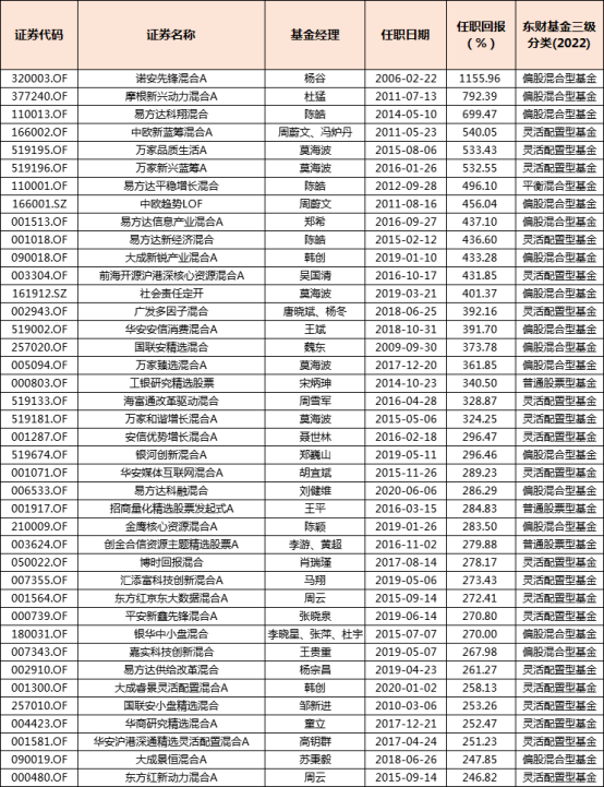 Choice统计显示,截至10月9日,能满足上述条件的主动权益基金有145只(只含主代码,下同),其中诺安先锋混合A、摩根新兴动力混合A、易方达科翔混合、中欧新蓝筹混合A、万家品质生活A、万家新兴蓝筹A的任职回报高达500%以上。
