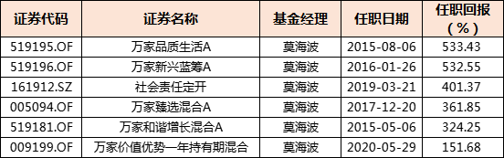 万家基金的莫海波有6只基金,是在榜数量最多的基金经理。