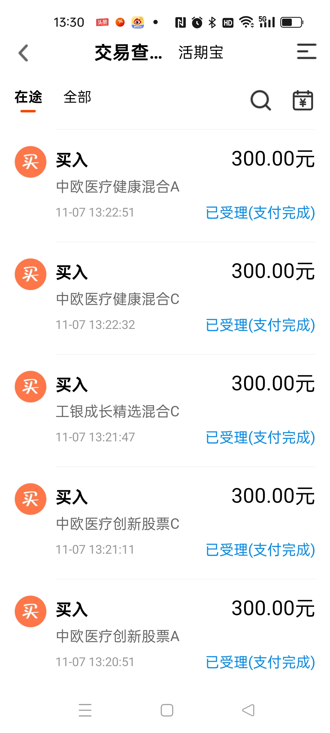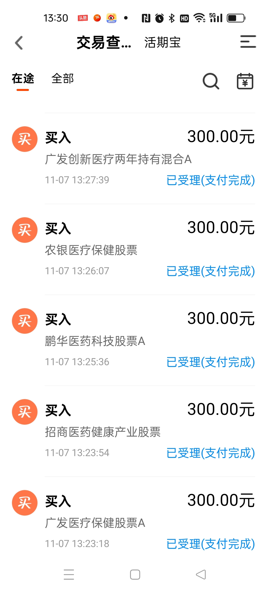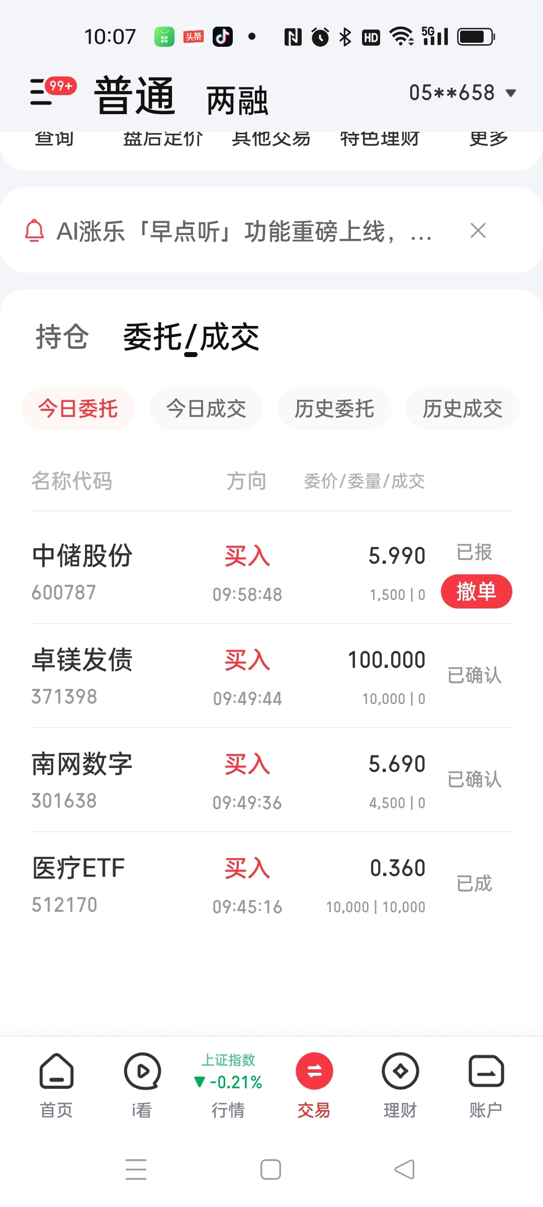 上午我又买了代码:512170-医疗ETF,又是一万份额,最近在0.36元这个价格,一直在低吸数次,耐心潜伏。然后再次挂单5.99元买600787中储,就看是否会成交了,我认为这股也快要发力了。